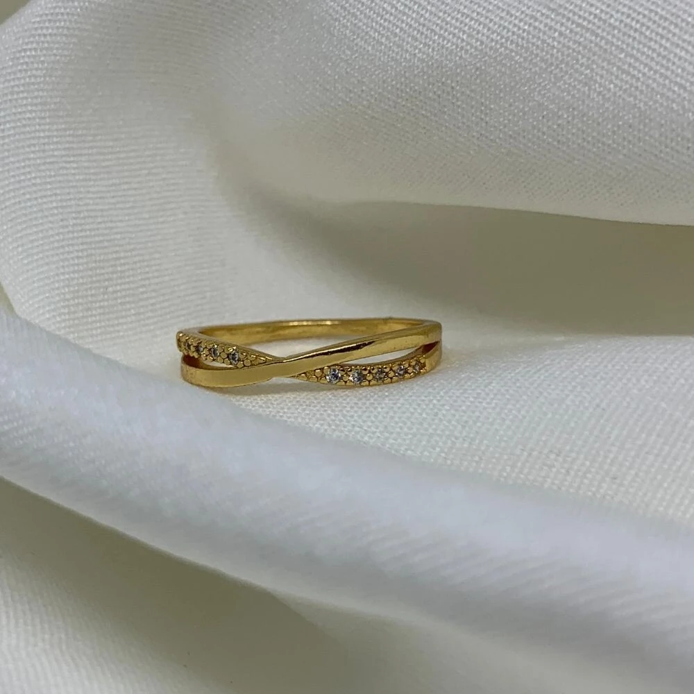 Anel com uma fileira lisa e uma cravejada em zircônias entrelaçadas.